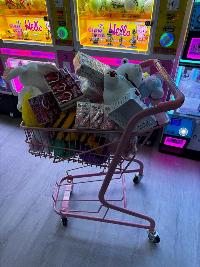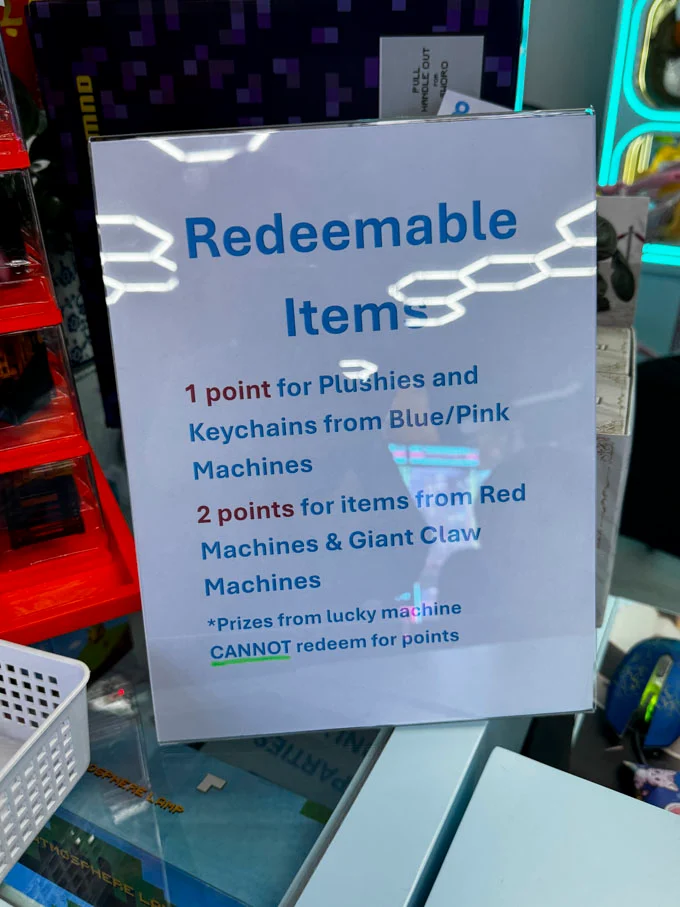 The venue features regularly updated toy selections, authentic licensed plushies, and a system where winnings from the claw machines are converted into points for redeemable prizes.
