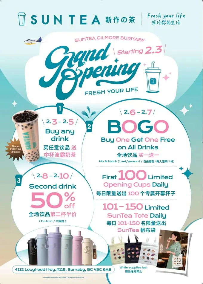 A new bubble tea shop has opened in Burnaby with SunTea launching its latest location at Gilmore Place. Known for fruit teas and milk teas, the brand has introduced several opening promotions alongside seasonal and Tea of the Month features.